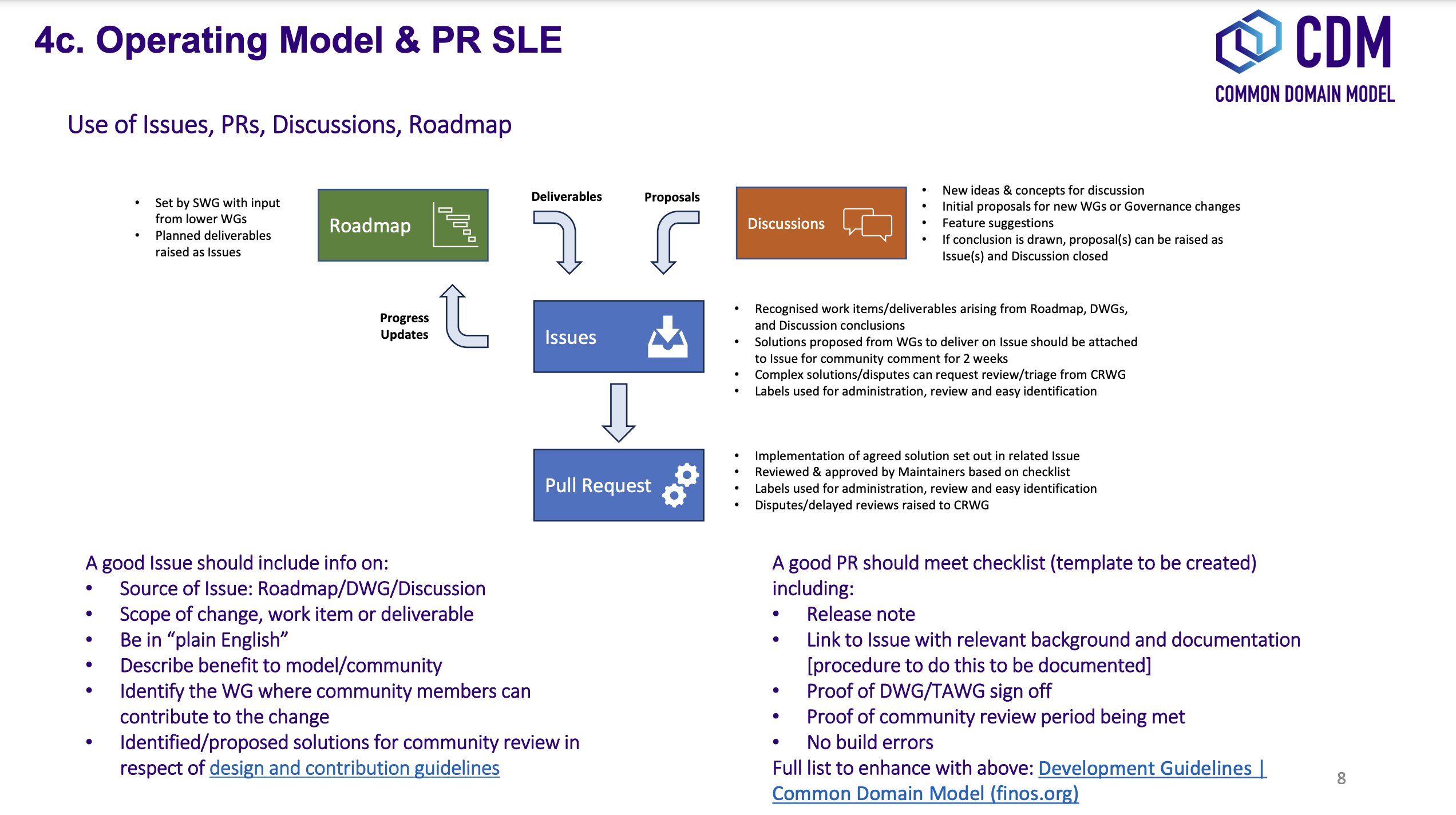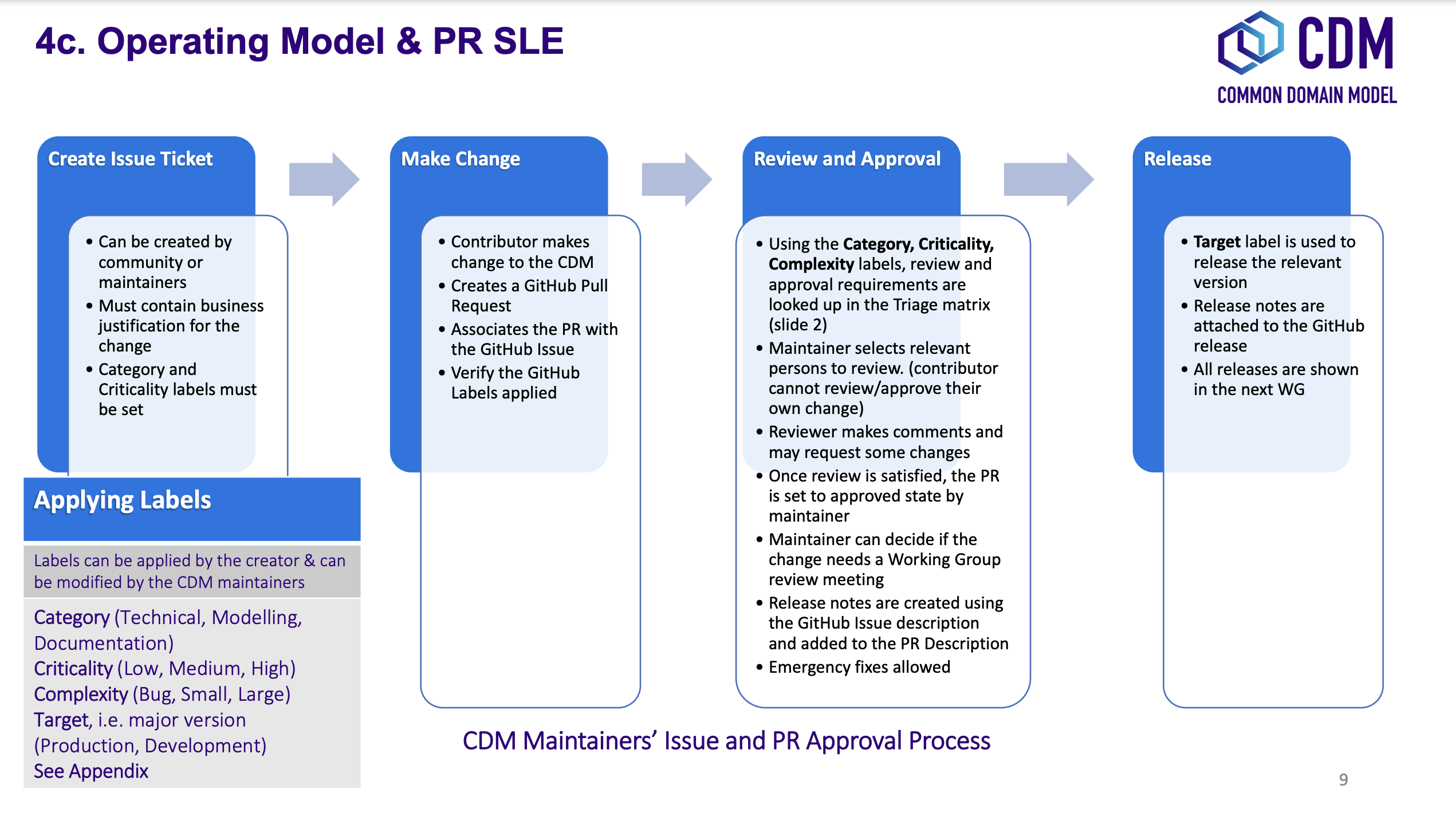 The CDM documentation must be kept up-to-date with the model in production. Where applicable, the Contributor should provide accompanying documentation (in text format) that can be added to the CDM documentation for their proposed changes.
